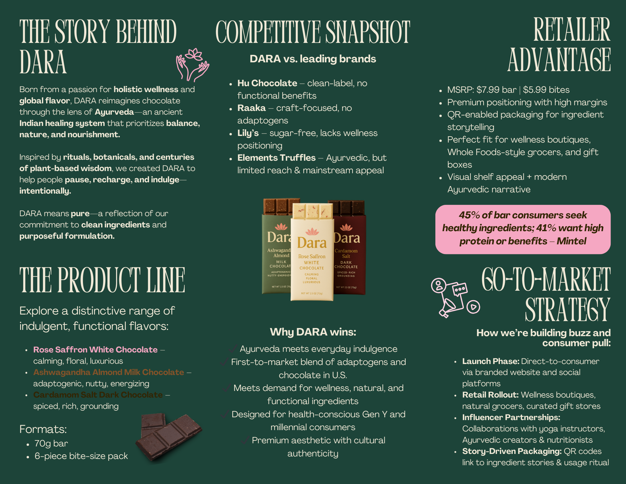 For my marketing capstone, we were asked to develop a new product in the chocolate category. I wanted to create something that felt personal. As a South Asian, I’ve seen so many wellness trends in the West trace back to Eastern practices. That’s what inspired DARA — a functional chocolate rooted in Ayurveda, designed to let people indulge with intention. The brand came together over the course of the semester through research, strategy, and storytelling.